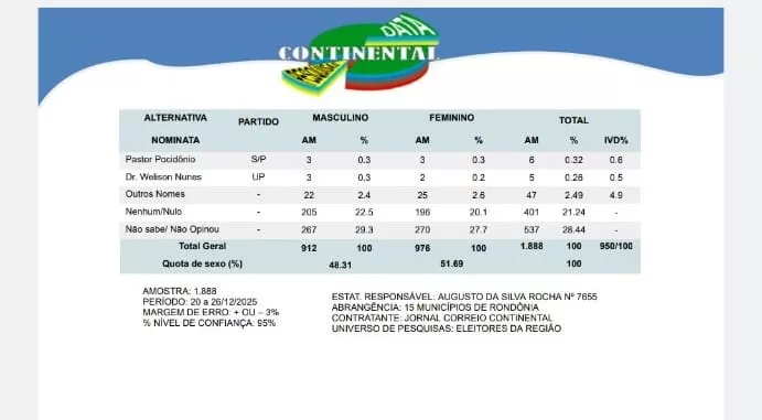 A pesquisa ouviu 1.888 eleitores, entre os dias 20 e 26 de dezembro de 2025, em 15 municípios de Rondônia, com margem de erro de ±3% e nível de confiança de 95%. O estudo também aponta um cenário ainda aberto, com percentual significativo de eleitores indecisos, o que indica que o quadro eleitoral pode sofrer alterações até o pleito.