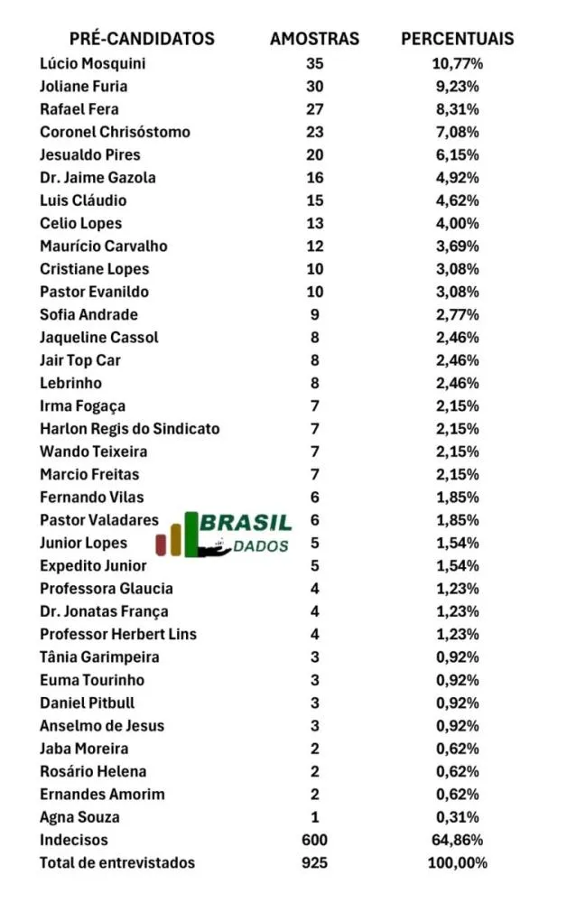 Dentre os nomes citados, o deputado Lúcio Mosquini aparece na frente, com 10,77%, seguido de perto por Joliane Furia (9,23%) e Rafael Fera (8,31%), compondo o pelotão de frente desta primeira aferição do Instituto Brasil Dados.