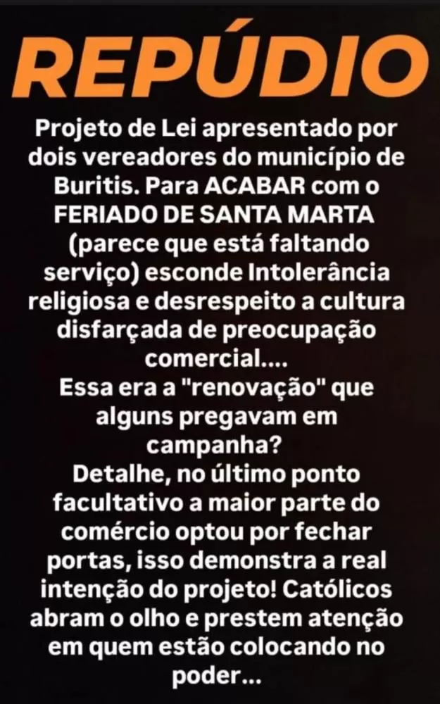 Um vídeo publicado pelo vereador Renato Leitão nas redes sociais acendeu o alerta entre os católicos de Buritis nesta quinta-feira (27). Na gravação, o parlamentar relata que durante a 21ª Sessão Ordinária da Câmara Municipal, o presidente da Casa, Ivan da Farmácia, declarou que pretende pautar novamente um projeto de lei que visa retirar o feriado municipal de Santa Marta e transformá-lo em um “dia alusivo”.