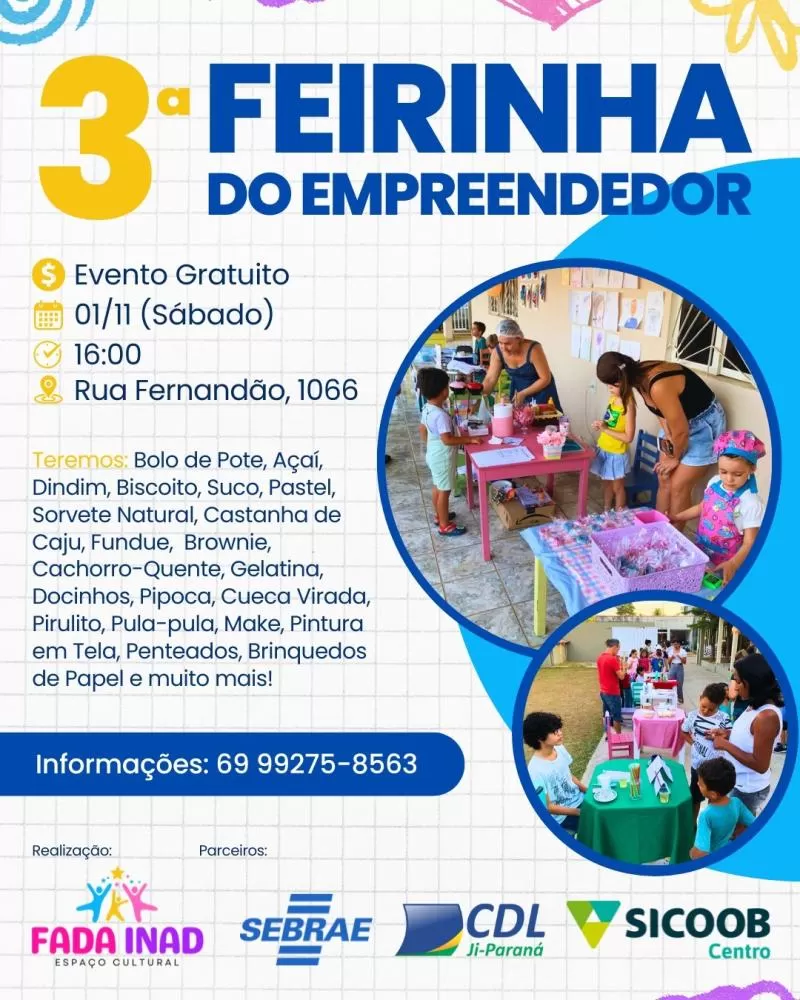 A 3ª edição da Feirinha do Empreendedor promete movimentar o próximo sábado (1º de novembro), das 16h às 18h, no Fada Inad Espaço Cultural, localizado na Rua Fernandão, 1066, bairro Dom Bosco. O evento tem como objetivo incentivar o protagonismo infantil e despertar desde cedo o interesse das crianças pelo empreendedorismo e pela criatividade.